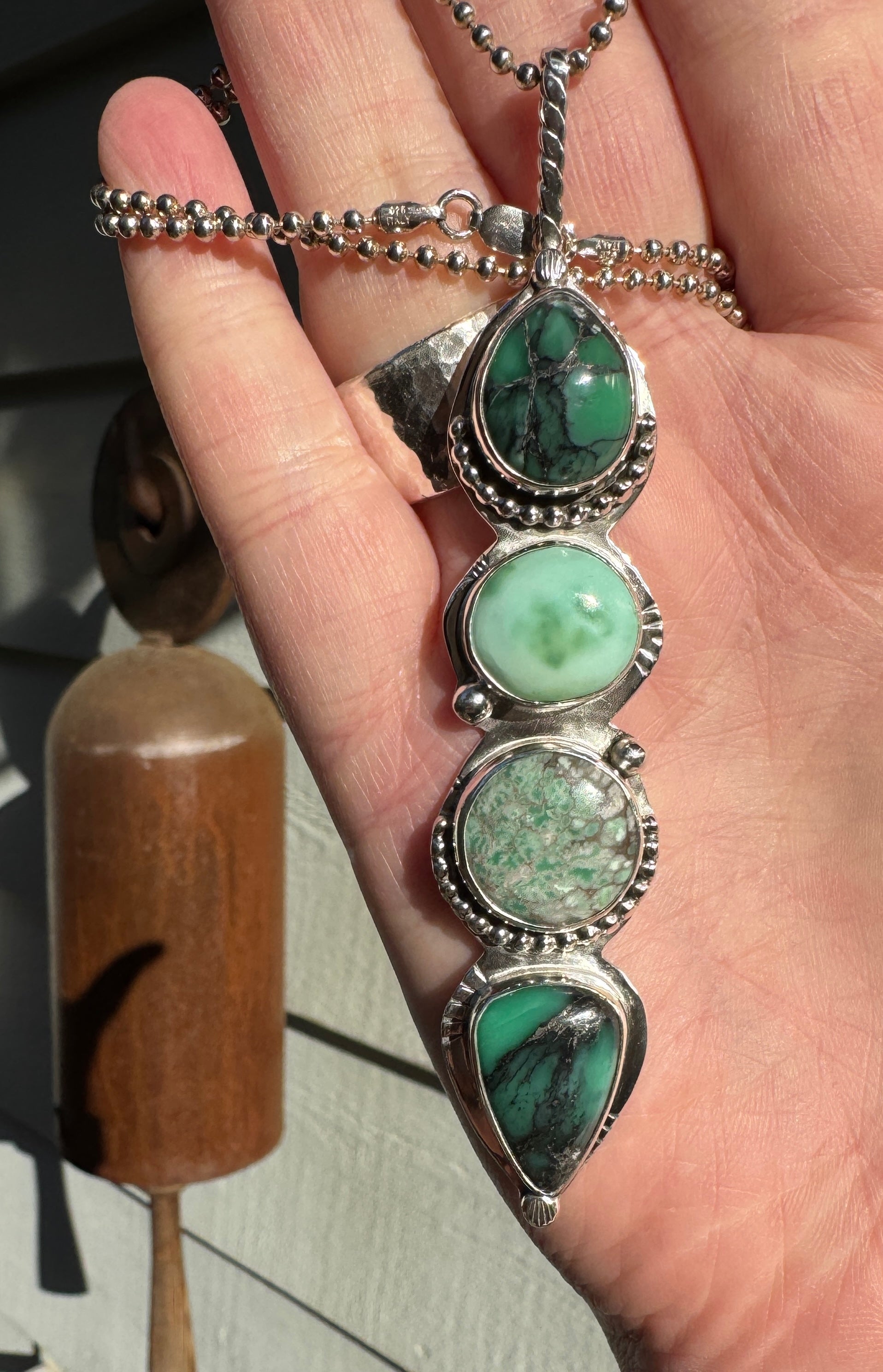 Handmade 4 stone variscite and turquoise statement pendant set in sterling silver with beaded wire and hand stamped detail. With an 18” sterling silver chain. Pendant is 4” long including bale.