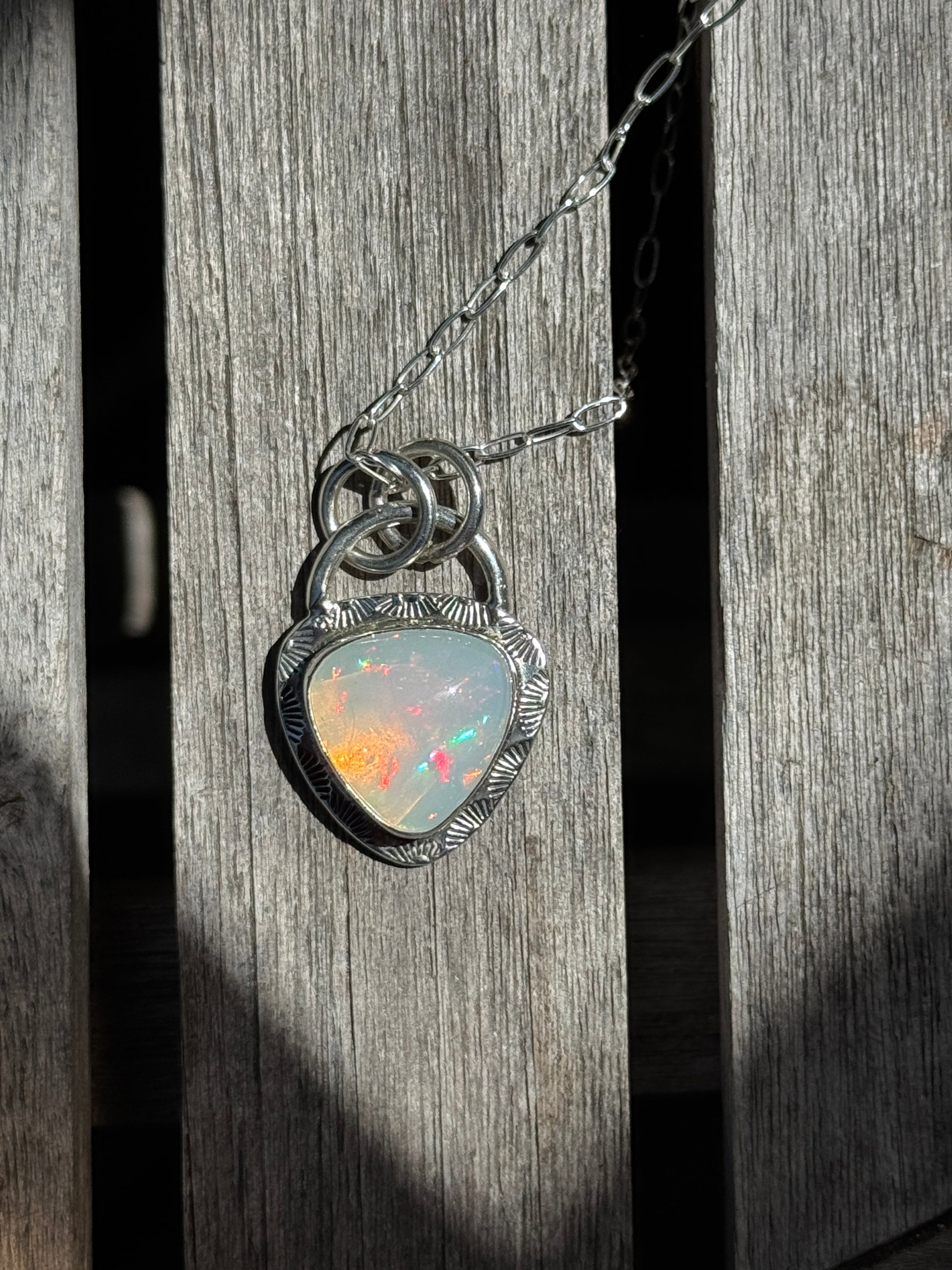 Handmade Welo Opal set in sterling silver with hand stamped detail - on an 18” sterling silver chain.